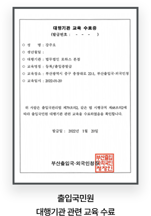 - 現) 출입국민원 대행기관 관련 교육 수료